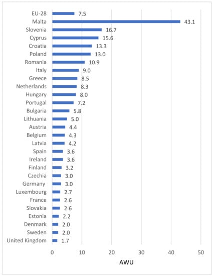 Recently, the number of workers employed in agriculture has decreased and that in the services sector has increased in Poland and the majority of developed economies. A significant element of the analysis of the economic situation of agriculture is the relationship among production factors. An indicator describing the type of production techniques used is the number of workers per 100 ha of utilized agricultural area. From 2010 to 2019, that ratio ranged from 1.7 AWU in the United Kingdom to 43.1 AWU in Malta. Poland had, on average, 13 workers per 100 ha (Figure 4). The surveys support the view that, in Poland, excessive employment in agriculture and a negative labor–land ratio still persist. Parzonko [] underlined that this results from an adverse agrarian structure, the so-called covert unemployment in agriculture. In the examined period, the analyzed ratio declined in most member states (except the Netherlands, Austria, Malta, Slovenia, the United Kingdom, and Greece).