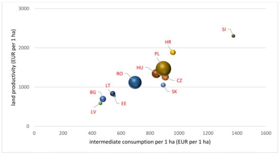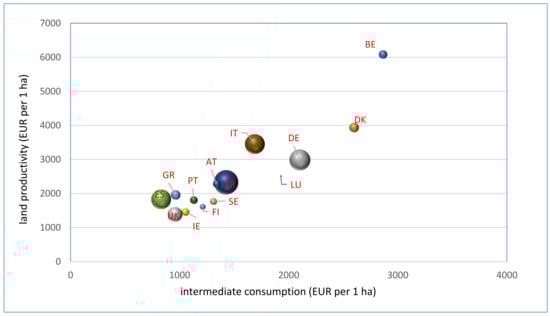 The evaluation also covered labor input per 100 hectares (ha) of UAA and land productivity measured as the production value per 1 ha of utilized agricultural area. In addition, the relationship between the level of intermediate consumption per 1 ha of UAA and land productivity was examined using Pearson’s correlation coefficient. A comparison of the level of output intensity with land productivity will be the basis for identifying countries in which, due to the low level of expenditure, further intensification processes are not contrary to the concept of sustainable development.