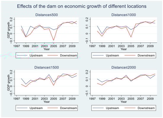Figure 2 provides insights about the possible economic effects of the dam along the Yangtze River within 500 km/1000 km/1500 km/2000 km away from the dam site. By just focusing on the treatment group, samples closer to the dam site in the downstream area is with slower GDP comparing to the upstream counties. In the year 2005, both of the downstream and upstream regions have a declining trend especially for the counties within the distance of 500 km. However, this is not always the case; the GDP growth of the downstream region tends to exceed the upstream group after 2009, when the TGD project was completed.