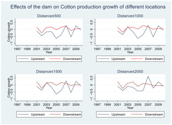 Effects of the damming on the growth rate of cotton production for upstream and downstream counties. Note: the unit of the distance in each graph is km.