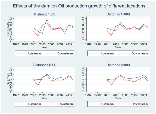 Effects of the damming on the growth rate of oil production for upstream and downstream counties. Note: the unit of the distance in each graph is km.