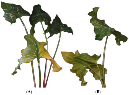Leaves of Zantedeschia elliottiana ‘Black Magic’. (A) control (B) conditioned in GA3 at a concentration of 300 mg dm−3 and stored in 8HQC.