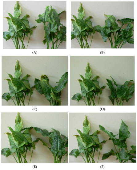 Leaves of Zantedeschia ‘Albomaculata’ 6 days after conditioning and insertion into water. (A)—from left—control leaves, from right—conditioned in MemT at concentration of 25 mg dm−3; (B)—from left—control leaves, from right—conditioned in MemT at concentration of 50 mg dm−3; (C)—from left—control leaves, from right—conditioned in MemT at concentration of 75 mg dm−3; (D)—from left—control leaves, from right—conditioned in MemTR at concentration of 25 mg dm−3; (E)—from left—control leaves, from right—conditioned in MemTR at concentration of 50 mg dm−3; (F)—from left—control leaves, from right—conditioned in MemTR at concentration of 75 mg dm−3.