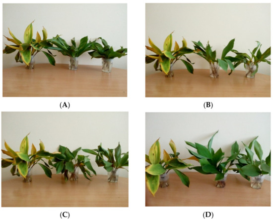 Leaves of Convallaria majalis 8 days after conditioning and insertion into water. (A)—from left: control leaves, conditioned in [Q-C12][Gib] at concentration of 50 and 100 mg dm−3; (B)—from left: control leaves, conditioned in [Gib][Ach] at concentration of 50 and 100 mg dm−3; (C)—from left: control leaves, conditioned in [Q-C2][Gib] at concentration of 50 and 100 mg dm−3; (D)—from left: control leaves, conditioned in [Q-C12][Gib] at concentration of 50 and 100 mg dm−3.