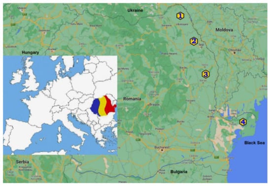 Geographic regions of collected honey samples (1—Botosani County; 2—Iasi County; 3—Vaslui County; 4—Tulcea County).
