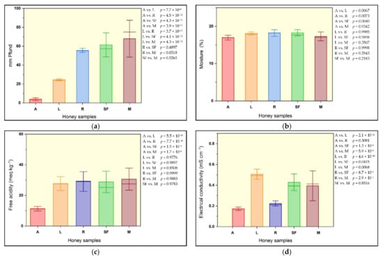 The color of honey has an important visual impact on the consumers. In different parts of the world, honey is consumed primarily because of its color hue: some consumers prefer light-colored honey, others dark-colored. This honey color palette depends on certain factors, such as the botanical origin, the composition of the nectar, the amount of pigments, the extraction operations, temperature, storage conditions and time [3,28]. The color of the studied honey samples varied from water-white (0.2 mm Pfund) in acacia honey samples to amber (86.1 mm Pfund) in mint honey samples. The average color intensity increased as follows: acacia honey < linden honey < rapeseed honey < sunflower honey < mint honey (Figure 2a). The color of the studied acacia honey samples was similar to the color of acacia honey from Croatia [29]; various studies show that for the same botanical origin, honey samples from different regions exhibit various colors; for example, sunflower honey color intensity varied from 33.66 mm Pfund to 114.00 mm Pfund (Table 3).