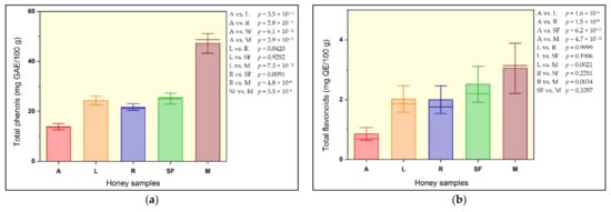 - Al-Farsi, M.; Al-Amri, A.; Al-Hadhrami, A.; Al-Belushi, S. Color, flavonoids, phenolics and antioxidants of Omani honey. Heliyon 2018, 4, e00874. [Google Scholar] [CrossRef] [PubMed]