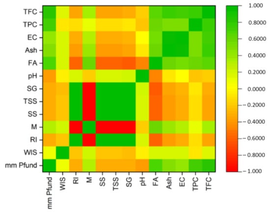 The total soluble solids (TSS) represented by soluble sugars, expressed as Brix degrees, were obtained from the table of correspondence between the refractive index at 20 °C and the Brix degrees [22].
