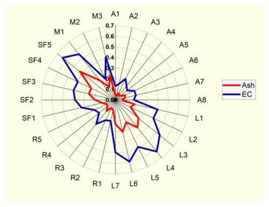 Radial graph of correlation between two parameters: ash content (%) and electrical conductivity (EC) (mS cm−1).