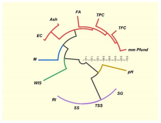 Correlations between the physicochemical parameters of the studied honey samples were revealed using the Pearson correlation coefficient r value; these results are arranged and presented as a heatmap in Figure 4. Moisture (M) content had a strong negative correlation with four parameters: refractive index (RI) (r = −1.0), solid substances (SS) (r = −1.0), total soluble substances (TSS) (r = −1.0) and specific gravity (SG) (r = −0.99). There were some strong positive linear correlations (r = +1) between three parameters: refractive index (RI), solid substances (SS) (r = +1) and total soluble solids (TSS); strong positive linear correlations (r = +0.99) were also noticed between specific gravity (SG) and refractive index (RI), solid substances (SS) and total soluble solids (TSS). Another strong positive correlation (r = +0.95) stood out between ash (Ash) and electrical conductivity (EC) (Figure 5). Phenolic compounds exhibit a close positive relationship with color, thus explaining the Pearson coefficient of +0.72 determined between total phenol content (TPC) and color (mm Pfund), and +0.81 between total flavonoid content (TFC) and color (mm Pfund) (Figure 6). There was also a close positive relationship between these two compounds and antioxidant properties, the Pearson coefficient having a high value of +0.76. Total phenol content (TPC) exhibited moderate positive correlations with free acidity (FA) (r = +0.57), electrical conductivity (EC) (r = +0.53) and with ash (Ash) (r = +0.51). Total flavonoid content (TFC) had strong positive correlations with ash (Ash) (r = +0.76) and electrical conductivity (EC) (r = +0.73), and a moderate positive correlation with free acidity (FA) (r = +0.65). Moderate positive correlations were also found between free acidity (FA) and color (mm Pfund) (r = +0.68) and moisture (M) (r = +0.59). There are many other studies exploring the correlations between honey parameters. Pontis et al. [17] reported strong correlations between total phenolic content and color (r = +0.967), total flavonoid content and color (r = +0.924) of Brazilian honey. Al Farsi et al. found strong correlations for color vs. flavonoids (+0.999) and color vs. phenols (+0.974) in honey samples of Apis mellifera honeybees from regions within the Sultanate of Oman [18], with higher Pearson coefficient values compared to those obtained in our study. Total flavonoid content was significantly correlated with color (r = +0.82) in Brazilian honey samples, as reported by De Almeida et al. [53]. Cimpoiu et al. obtained a strong linear correlation of +0.86 between total phenolic content and the color intensity in Romanian honey [19]. It is known that pigments provide the color hue of honey, specifically those pigments with antioxidant properties, such as carotenoids. Many studies have shown strong correlations between color intensity and antioxidant compounds: Kavanagh et al. in Irish honey (color/TPC, r = +0.6) [54]; Ciappini et al., in Argentinian honey (flavonoid content and color, r = +0.93) [55]; Moniruzzaman et al. [56] in Bangladesh honey samples (color with phenolic acids, r = +0.943 and flavonoids r = 0.926); Aazza et al. [32] in Portuguese honey (color/TPC, r = +0.685; color/TFC, r = 0.843); Živković et al. [35] in Serbian honey (color/TPC, r = +0.815; color/TFC, r = 0.771); Flanjak et al. [29] in Croatian honey (color/TPC, r = +0.925). The correlations between the total phenol (TPC) and total flavonoid (TFC) contents were also confirmed in a study on monofloral honey from Sicily (Italy) (r = +0.919), a higher value than that found in our research [43]. Al Farsi et al. found strong positive correlations between flavonoids and phenolics (r = +0.977) [18], as did Živković et al., who observed a correlation of +0.967 between TPC and TFC in Serbian honey samples [35]. Aazza et al., on commercial Portuguese honey, found strong correlation between TPC and TFC (r = +0.861) [32], while in Romanian honey, correlation reached a level of 0.7512 [8]. Flanjak et al., found a strong statistically significant positive correlation between honey EC and TPC (r = +0.837) [29], while in another study, this correlation had a lower value (r = +0.55) [54]. In sunflower honey samples from Serbia, Živkov Baloš et al. found a moderate correlation between electrical conductivity and ash mass fraction (r = +0.611) [51]. To compare similarities between studied parameters, we used a color circular hierarchical cluster analysis (HCA). Figure 7 shows the formation of five clusters, with the following parameters in the first cluster: refractive index (RI), solid substances (SS), total soluble substances (TSS) and specific gravity (SG). These parameters exhibited strong positive linear correlations. The second cluster also consisted of parameters with strong relationships: total flavonoid content (TFC), color (mm Pfund), free acidity (FA), electrical conductivity (EC) and ash (Ash). The parameters forming other clusters were moisture content (M), water-insoluble solids (WIS) and pH.