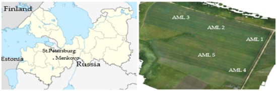 The contrasting and complex structure of the soil cover is formed by small contour complexes of light and medium loamy soddy-podzolic gleyic soils (Gleyic Albic Retisols). The soil-forming rock is heavy loamy and clayey, carbonate and carbonate-free moraine with a thickness of 70–130 cm, underlain by glaciolacustrine sand. After a precision survey of the agricultural landscape using 38 soil profiles [], 5 key areas were selected for the experiment, representing agricultural microlandscapes (AML), differing in lithogenic basis and geochemical regimes. AML 1 is eluvial (17% S, altitude is 102 m) on soddy-weakly podzolic gleyic medium loamy soil formed on the thin and medium thick heavy loamy moraine. AML 2 is eluvial-accumulative (8% S, altitude is 97 m) on soddy-weakly podzolic light loamy soil formed on medium-thick clay moraine. AML 3 is transit-eluvial (49% S, altitude is 92 m) on soddy-weakly podzolic gleyic light loamy eroded soil formed on the thin and medium-thick clayey moraine. AML 4 is accumulative (18% S, altitude 95 m) on soddy-weakly podzolic gleyic residual-calcareous medium loamy soil formed on thin clayey carbonate moraine. AML 5 is accumulative (8% S, altitude 94 m) on soddy-podzolic gley medium loamy soil formed on the thin clayey moraine. Their agrophysical and agrochemical properties within the arable layer are presented in Table 1.