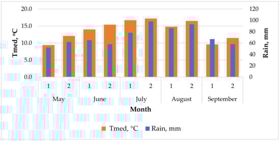 The weather and climate conditions of the test plot are favourable for the effective use of fertilizers. The best indicators of crop productivity are ensured in years with parameters of heat and moisture supply close to the average with a slight deviation towards an increase in heat supply and aridity []. During the years of research, due to global climate change, the heat supply for the growing season increased by 13% compared to the average long-term data (Figure 2).