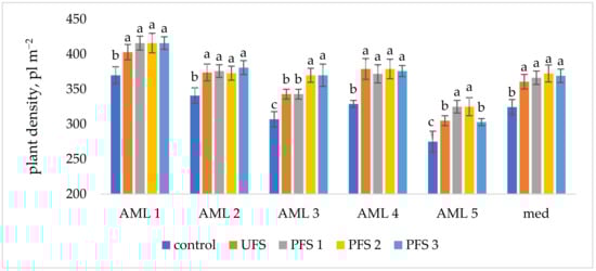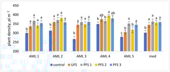 The noticeable damage to oats by red-brown spot in combination with very unfavourable weather and climate conditions negatively affected the survival of the plants in the phase of full ripeness, which varied between 56 and 85%. Its minimum values were characteristic of AML 5. Here, the planting density of oats turned out to be lower than in the most favourable AML 1 on average over the variants of factor B by 24% (p ≤ 0.05) (Figure 8). The residual effect of organic fertilizers and the application of mineral ones increased the sowing density by 13% on average for the variants (from 324 to 367 plants m−2) (p ≤ 0.05). Precise fertilization systems, as in the winter wheat crops, did not form a stable significant superiority over the UFS. The best effect was achieved from PFS 2 in AML 3 and AML 5, which were unfavourable in terms of a set of indicators. The spatial variability of plant density decreased slightly: from 11% in the control to 10% in the UFS and 9% in the PFSes.