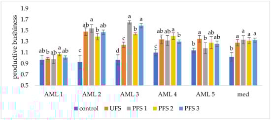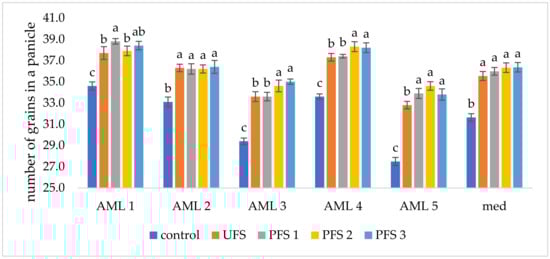 The number of grains per oat panicle in the experiment. The different letters represent statistically significant (p ≤ 0.05) differences between the tested options of fertilizer application. Error bars show the standard deviation of the mean value (n = 15). AML 1 is the eluvial agricultural microlandscape, AML 2 is the eluvial-accumulative agricultural microlandscape, AML 3 is the transit-eluvial agricultural microlandscape, AML 4 is the accumulative agricultural microlandscape, AML 5 is the accumulative agricultural microlandscape. Control is the option without fertilizers, UFS is the uniform application of organic and mineral fertilizers, PFS 1 is the differentiated application of organic and uniform application of mineral fertilizers, PFS 2 is the differentiated application of mineral and uniform application of organic fertilizers, PFS 3 is the differential application organic and mineral fertilizers.