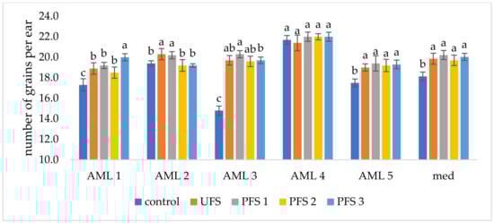 The number of grains per ear of winter wheat in the experiment. The different letters represent statistically significant (p ≤ 0.05) differences between the tested options of fertilizer application. Error bars show the standard deviation of the mean value (n = 15). AML 1 is the eluvial agricultural microlandscape, AML 2 is the eluvial-accumulative agricultural microlandscape, AML 3 is the transit-eluvial agricultural microlandscape, AML 4 is the accumulative agricultural microlandscape, AML 5 is the accumulative agricultural microlandscape. Control is the option without fertilizers, UFS is the uniform application of organic and mineral fertilizers, PFS 1 is the differentiated application of organic and uniform application of mineral fertilizers, PFS 2 is the differentiated application of mineral and uniform application of organic fertilizers, PFS 3 is the differential application organic and mineral fertilizers.