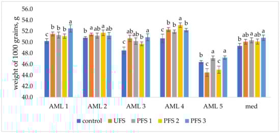 Winter wheat grain formation took place under arid conditions (HTC in July was 0.6 units), which reduced the positive effect of the fertilizer systems studied in the experiment on an important indicator of grain crop productivity—the weight of 1000 grains (Figure 6). The best parameters of fertilizer efficiency were obtained in AML 3 and AML 4, where they increased the weight of 1000 grains by 4%. On average over the fertilized variants of the experiment, this indicator increased by 2% (from 49.3 to 50.3 g) and more significantly (by 3%) (p ≤ 0.05) in the PFS 3 variant. The maximum positive effect of 5% (p ≤ 0.05) was achieved in PFS 3 variant in AML 1 and the PFS 2 variant in AML 4. Variants of the UFS and PFS 3 under the landscape-ecological conditions of AML 5 caused a reduction in the weight of 1000 grains by 4% (p ≤ 0.05).
