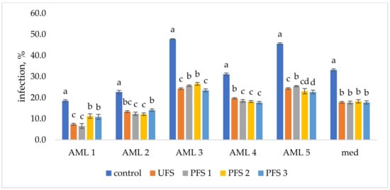 Oat infection with red-brown spot pathogen. The different letters represent statistically significant (p ≤ 0.05) differences between the tested options of fertilizer application. Error bars show the standard deviation of the mean value (n = 15). AML 1 is the eluvial agricultural microlandscape, AML 2 is the eluvial-accumulative agricultural microlandscape, AML 3 is the transit-eluvial agricultural microlandscape, AML 4 is the accumulative agricultural microlandscape, AML 5 is the accumulative agricultural microlandscape. Control is the option without fertilizers, UFS is the uniform application of organic and mineral fertilizers, PFS 1 is the differentiated application of organic and uniform application of mineral fertilizers, PFS 2 is the differentiated application of mineral and uniform application of organic fertilizers, PFS 3 is the differential application organic and mineral fertilizers.