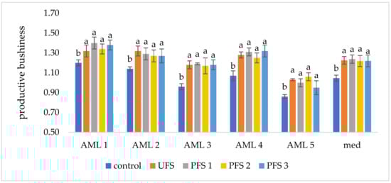 In eluvial AMLs, they turned out to be less than unity. The positive effect of fertilizers on the productive tillering of plants was manifested in AMLs with better moisture conditions, located in the lower parts of the relief. The exception to this rule was AML 5 with acid soil. On average over the experimental variants, due to the use of fertilizers, this important indicator increased by 29% (from 1.02 to 1.32 units) (p ≤ 0.05).
