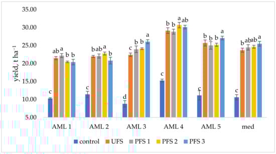 The different letters represent statistically significant (p ≤ 0.05) differences between the tested options of fertilizer application. Error bars show the standard deviation of the mean value (n = 15). AML 1 is the eluvial agricultural microlandscape, AML 2 is the eluvial-accumulative agricultural microlandscape, AML 3 is the transit-eluvial agricultural microlandscape, AML 4 is the accumulative agricultural microlandscape, AML 5 is the accumulative agricultural microlandscape. Control is the option without fertilizers, UFS is the uniform application of organic and mineral fertilizers, PFS 1 is the differentiated application of organic and uniform application of mineral fertilizers, PFS 2 is the differentiated application of mineral and uniform application of organic fertilizers, PFS 3 is the differential application organic and mineral fertilizers conditions for the crop were formed in accumulative AML 4 (Table 4).