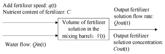 According to the principle of fertilizer balance, Equation (1) can be obtained when the system reaches dynamic equilibrium. This can be accomplished by following the conservation of fertilizer quantity. Furthermore, Equation (2) can be obtained by following the conservation of fertilizer solution volume in the fertilizer mixing barrel.