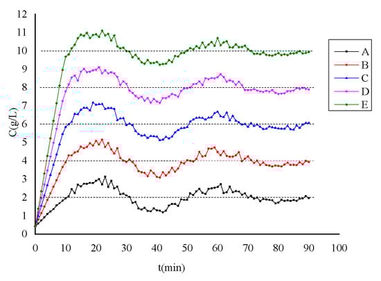 After setting the target fertilizer concentration at the outlet of the fertilizer mixing barrel, the actual fertilizer concentration was measured, and the change curve of fertilizer concentration was obtained. In Figure 11, A, B, C, D, and E represent the fertilizer solution concentration change curves with the set values of 2, 4, 6, 8, and 10 g/L, respectively. It can be seen that the export of fertilizer solution concentration reached a set value after a certain time to prevent any further rise in the fertilizer solution concentration, which would yield excessive overshoot. Thus, the software program limited the range within ±1 g/L, so that the fertilizer solution concentration under the adjustment of the control system slowly became close to the set value. Over time, the concentration of the fertilizer solution fluctuated less from the the set concentration.