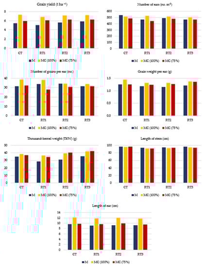 No effect of the interaction between the tillage and weed control method on the grain yield and crop components of spelt wheat was found (Figure 1).