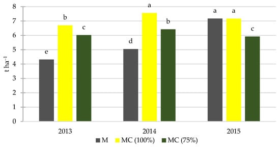 The interaction between weed control method and year of study had a significant effect on the grain yields (Figure 2). The spelt wheat was more productive at full herbicide rate across all years of study. However, in 2015, the full-herbicide (MC 100%) and mechanical-control (M) plots produced equal yields of 7.17 t ha−1. The mechanically weeded variant (M) performed the worst in 2013 and 2014.