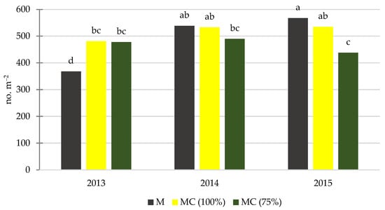 Interaction of the weed control methods and research years in determining number of ears of spelt wheat. M—mechanical; MC (100%)—mechanical and chemical (dose of herbicides 100%); MC (75%)—mechanical and chemical (dose of herbicides 75%). Different letters denote significant differences (p ≤ 0.05). The same letter represents not significantly different values (p ≤ 0.05).