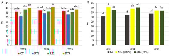 Interactive dependencies of the tillage systems (A), weed control methods (B), and research years in determining thousand-kernel weight of spelt wheat. CT—conventional tillage; RT1, RT2, RT3—reduced tillage; M— mechanical; MC (100%)—mechanical and chemical (dose of herbicides 100%); MC (75%)—mechanical and chemical (dose of herbicides 75%). Different letters denote significant differences (p ≤ 0.05). The same letter represents not significantly different values (p ≤ 0.05).