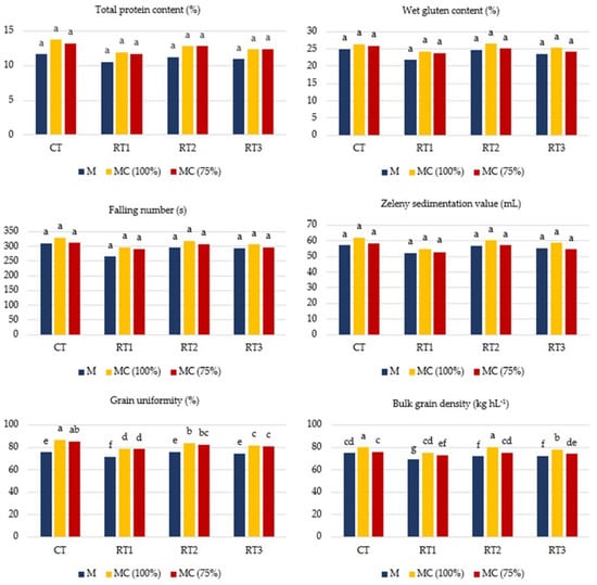 Interaction of the tillage systems and weed control methods in determining quality parameters of spelt wheat grain. CT—conventional tillage; RT1, RT2, RT3—reduced tillage; M—mechanical; MC (100%)—mechanical and chemical (dose of herbicides 100%); MC (75%)—mechanical and chemical (dose of herbicides 75%). Different letters denote significant differences (p ≤ 0.05). The same letter represents not significantly different values (p ≤ 0.05).