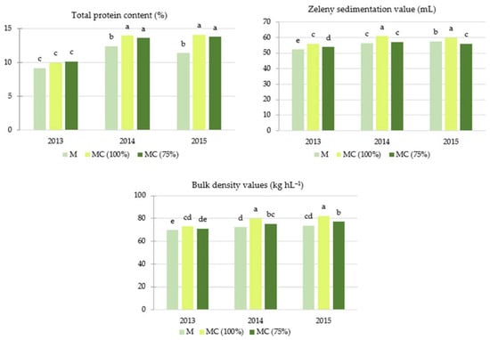 The interaction between weed control method and year of study had a significant effect on the total protein content, Zeleny sedimentation value, and bulk density of spelt wheat grain (Figure 6). Crops mechanically + chemically treated at full (100%) and reduced (75%) herbicide rates had similar protein levels in 2014 and 2015, significantly higher than those in mechanically weeded grain (M). Subjecting the crop to a combined mechanical/chemical treatment at full herbicide rate (CM 100%) significantly boosted the sedimentation value across all years of study. In terms of bulk density, in 2014 and 2015, the mechanically weeded variant and the full-herbicide variant (MC 100%) performed the worst and best, respectively. For 2013, there was no major difference in density between the reduced-herbicide variant (MC 75%) and mechanical-only variant methods (M). The full herbicide rate (MC 100%) significantly boosted the parameter against the mechanical-only weeded plots.
