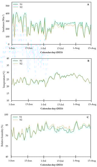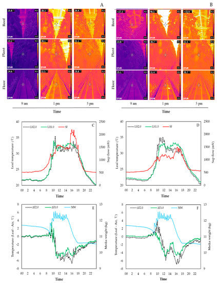 Furthermore, the graphs showed that the trend of the difference between the leaf and air temperature in the greenhouse was also similar in the S1 and S2 treatment (Figure 3E,F). From 9 a.m. to 12 p.m., the leaf temperature at the top portion (2 m height) of the plant was higher than the air temperature, and it was highest (4 °C) in the S2 treatment. From 12 p.m. to 10 p.m., the leaf temperature was lower than the air temperature, and this difference was highest around 6 °C at 4 pm in both S1 and S2 treatments. The weight of substrate media fluctuated and was similar in both treatments, and it was higher in both S1 and S2 treatments between 9 a.m. and 3 p.m. It fluctuated because of the supplied nutrient solution in the substrate media and the fact that transpiration occurred in the plant.