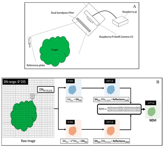 The cameras were installed at similar geometry of S1 and S2 treatments to minimize unexpected variables, and time series of raw images were collected from 9 a.m. to 5 p.m. at 30 min intervals from 5 August to 15 August 2021. The raw images were obtained by IR-cut filter disabled digital cameras (Raspberry Pi NoIR Camera V2, Sony IMX 219, Tokyo, Japan) with a dual-bandpass (transmits 660 nm, 850 nm) filter (CATALOSCOPE, Catalonix Inc., Seodaemun-gu, Seoul, Korea) to obtain red and NIR signals (Figure 2A). Due to the absence of the IR-cut filter and the presence of the dual-bandpass filter, the B and G components of the charge-coupled device (CCD) receive only the NIR (850 nm) signal, whereas the R component receives both NIR and red (660 nm) signal.