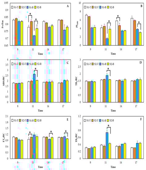 During the time, ABS/RC (absorption per active reaction center) and TRo/RC (trapped energy flux per active reaction center) showed a similar trend in both parts of the plants in both treatments, except at 11 am (Figure 4C,D). At 11 a.m., the ABS/RC and TRo/RC of lower leaves of plants were significantly higher in S1-treated plants compared to the S2 treatment. During the whole time period, the value of ABS/RC and TRo/RC was always more than 1.5.