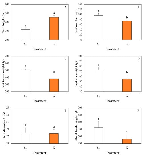 The stem diameter and shoot fresh weight were not significantly different between S1 and S2-treated plants (Figure 6E,F). It is possible that the duration of the growing period and the difference in light intensity between the treatments were not enough to significantly impact the stem diameter and total shoot fresh weight of the plant. Other researchers also found similar results in their experiments. Ha et al. [44] and Diaz-Perez [46] reported that the stem diameter of paprika plants grown in a greenhouse was not significantly different between the shade treatment and the control. Zhu et al. [57] reported that the shoot weight of Capsicum annum was not significantly different between plants treated with 0%, 30% and 50% low light intensity grown at a 75–85% field moisture capacity.