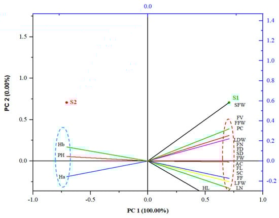 Principal component analysis (PCA) illustrates the variable treatment relationships between the treatments of plant growth and fruit characteristics of paprika. S1 and S2 indicate that plants were treated by single shade screen and double shade screens, respectively. The lines starting from the central point of the biplots display the negative or positive associations of the different variables, and their proximity specifies the degree of correlation with specific treatment. PH, plant height; LN, number of leaves; LFW, leaf fresh weight; LDW, leaf dry weight; SD, stem diameter; SFW, shoot fresh weight; FN, number of fruits; FFW, fruit fresh weight; FD, fruit diameter; FL, fruit length; FW, fruit width; PC, pericarp thickness; FF, fruit firmness; FV, fruit volume; SC, sugar content; AC, acidity; H-L, Hunter L; H-a, Hunter a; H-b, Hunter b.