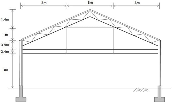 Since 2000, the standard design of a farmhouse distribution-type automation house has been updated by customizing crops through various studies, but the existing standard design has been used for glass greenhouses. We performed an analysis on the wide-span type glass greenhouse, which is the most common standard design (Figure 1).