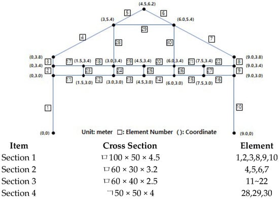 Modeling for structural analysis is divided into geometric modeling and load modeling. Geometric modeling is the process of transforming the shape of a structure so it can be analyzed. Geometric modeling of glass greenhouses converts the skeleton (frame) to nodes and elements. Some elements of the Korean glass greenhouse are manufactured in the form of trusses for structural reinforcement. In this study, in order to set the structure to the worst condition, geometric modeling was performed in a simplified form for the members of the truss. In addition, for the cross-sectional shape of the member, we used the cross-sectional information presented in the standard design. Geometric modeling for analysis in this process was pretreated as shown in Figure 2.