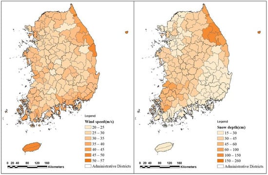 We used the mean and deviation values of the design wind speed studied previously according to the domestic weather conditions (Figure 4). The design wind speed and snowfall depth for each of the 170 administrative districts in Korea were presented using weather data from 72 points from 2010 to 2021. The average design wind speed was 32.05 m/s, and the deviation was 6.40 m/s [34]. Next, the snowfall load was calculated by multiplying the design snow depth by the unit volume weight and the reduction coefficient (Equation (4)):