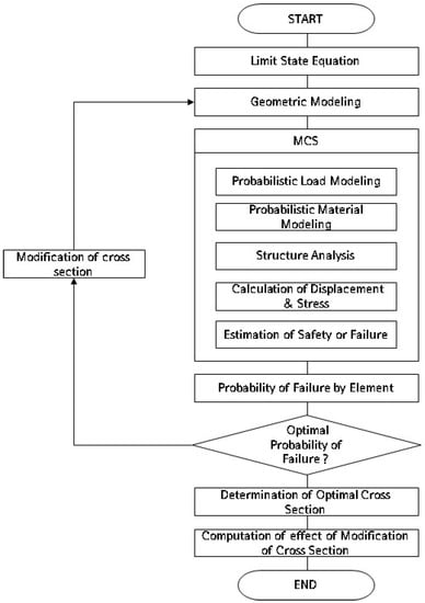 Structural reliability is defined as a multiple integral form for the combined probability density function of probability variables. If the nonlinearity of the marginal state equation is severe, an approximate method is used because it is difficult to accurately grasp the integration path [41]. Monte Carlo simulation (MCS) is the most common technique for approximating the probability of failure, and has the advantage of calculating the probability of failure without any modification to the marginal state equation [42,43,44]. The MCS extracts random numbers reflecting the distribution characteristics of probability variables to generate a sufficient number of sample groups of probability variables, and then substitutes the values of each generated probability variable into the marginal state equation to determine whether the value is greater than or less than zero, that is, whether the structure is safe or destroyed [45,46,47,48]. Through this, when extracting groups of probability variables, if the marginal state equation is observed times less than 0, the probability of failure can be estimated approximately as shown in Equation (6):
