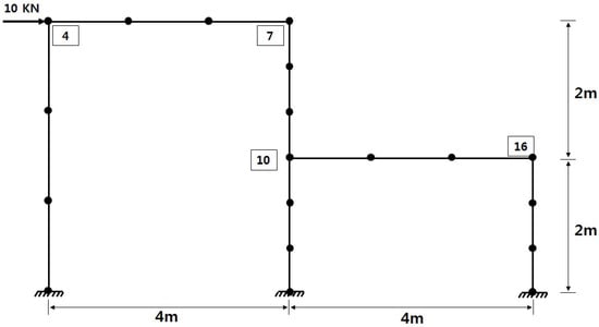 Shape and external load setting of 2-span Rahmen structures for initial verification. The numbers (4, 7, 10, 16) in Rahmen structures mean number of node.