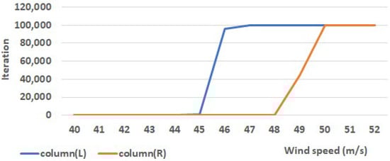 Next, the member with a high probability of failure was a pillar located on the right, indicating that both cranes are the most vulnerable due to wind loads. Thus, structures are more likely to be destroyed by wind loads in Korea than by snow loads and wind loads make the pillar most vulnerable. The analysis indicated that the pillars at both ends began to be destroyed at a wind speed of about 45 m/s. When the wind speed was 45 m/s, the left pillar was destroyed 1340 times, and at 46 m/s, it was destroyed 95,753 times (Figure 7). Therefore, considering the safety margin such as the weight of the greenhouse and crop load, the wind speed that the greenhouse can withstand is about 40 m/s. This amount of wind speed can be generated by typhoons, which corresponds to the intensity of typhoons at “Grade 3 (max. Grade 5)” in Korea [49]. Therefore, considering that the frequency and intensity of typhoons have increased due to climate change, the possibility of failure has also increased.