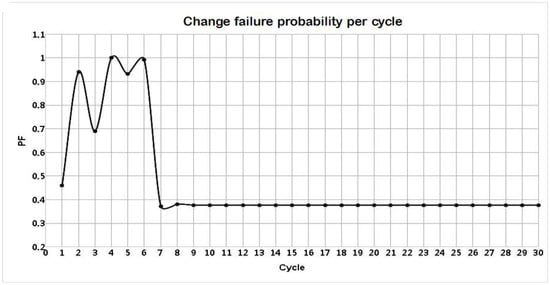 The probability of failure by snow load was analyzed as zero for all members. Cross-section optimization was performed based on the probability of failure by wind load. In addition, the failure probability was reviewed by applying the snow load to the set optimal cross-section. Based on the initial cross-section, members with a high possibility of failure by wind load were analyzed as left pillars, and 10 cycles were required for the optimal cross-section. Finally, the probability of converging failure was analyzed as 0.37728, which occurred in the left column as in the initial condition (Figure 8 and Figure 9). As a result, the total amount of materials was reduced by 18.31%. The final optimal cross-section is shown in Table 7. Comparing the optimal cross-section with the existing cross-section, the cross-section of the pillars at both ends decreased. In addition, the cross-section decreased even in the roof connected to the pillar.