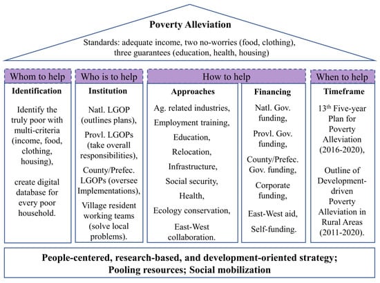 To eradicate extreme poverty effectively, several questions needed to be answered: whom to help, who should help, how to help, and when to help? Thus, we used a systemic approach, which holistically analyzed all participants and actors in the poverty alleviation program to gain a better understanding of poverty situations and the alternatives [33,34]. Figure 1 presents our framework for the implementation in China’s poverty alleviation program. Besides the conventional income standard, down-to-earth standards were set as the “two no-worries” and the “three guarantees”, which translate into no worries about food and clothing with a guarantee of education, health, and housing. Poor households were identified by their income and other basic needs, such as food (whether they stored enough food or their income could afford to buy enough food), clothing (whether they had adequate clothes already or their income could afford to buy clothes), education (whether nine-year compulsory education was guaranteed), health (whether health insurance covered all family members and whether any member was in serious illness), and housing (whether houses were safe). The identification of poor households involved a mixed top-down and bottom-up process; officials set up criteria and verified applications through a top-down process, while households filed application and discussed who were qualified through a bottom-up process (see details in Section 3.1). At the same time, information about their assets and the cause of their poverty was collected for further analysis and to find appropriate poverty alleviation measures. A unique file was created for each poor household and its members and then uploaded to an online information system for analysis and tracking throughout the whole anti-poverty process [35]. Together with local villagers, the identification process was conducted by village resident working teams, who were professionals dispatched by county-level or higher-level governments directly. County or prefecture LGOPs were overseeing the implementations of poverty eradication, provincial LGOPs took full responsibility to localize the plan in their governing areas, and the national LGOP was responsible for overall planning. Generally, there were nine approaches to reducing poverty: developing agriculture and related industries; employment training; providing free universal basic education and subsidizing higher education; relocating villagers from arduous and vulnerable areas; upgrading infrastructure, such as roads and telecommunication; providing universal social security and welfare; providing basic health care; compensating for ecological conservation services; and encouraging collaboration between eastern and western provinces. Different financial sources were raised to support poverty alleviation, including government funding, corporate funding, eastern provinces’ aid, and farmer or local entity self-funding. Moreover, the timeframe of poverty alleviation was clearly defined by two plans: “the 13th five-year plan for poverty alleviation (2016–2020)” and the “outline of development-driven poverty alleviation in rural areas (2011–2020)” [36,37]. Overall, poverty alleviation programs were people-centered, research-based, and development-oriented.