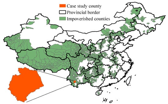 Since the foundation of the People’s Republic of China, poverty alleviation has been an important issue, as China was one of the poorest countries in the world due to destruction from long periods of war. From 1949 to 1986, poverty alleviation programs mainly worked through government relief and structural reform, i.e., the distribution of agricultural land to each household [25,26]. In 1986, a new institutionalized system—the Leading Group Offices of Poverty Alleviation and Development (LGOP) or fupinban—was created at central, provincial, prefectural, and county government levels to oversee poverty issues. Poverty alleviation policies were shifted from an assistance-oriented to a development-oriented approach [27]. Under the theory of development-oriented poverty alleviation, a new strategy called “Targeted Poverty Alleviation” was introduced in 2013 to accurately identify poor individuals and households, create anti-poverty measures, manage resources, and evaluate impact [25]. Some detailed anti-poverty measurements are demonstrated by previous studies. For example, land consolidation has supported rural development by increasing cultivated land area, improving rural production conditions, and alleviating ecological risks [22]; resettlement is used as a tool for poverty alleviation in China, especially for those who live in dispersed and remote villages [28]; health projects (medical insurance/aid/subsidy) have reduced patient payments and decreased the likelihood of trapping in poverty [29]. A case study of Fuping County in China has also provided practice details of “Targeted Poverty Alleviation” [25]. China had tremendous success in poverty alleviation by reducing the population in extreme poverty from 165.7 million in 2010 down to 5.5 million in 2019, contributing to about 35% of the world’s poor population reduction in these years [30,31]. However, impoverished counties still persist and are unequally distributed: most are in western China, while some are in central China due to the “island-effect” [32]. Similar to islands in oceans, these impoverished counties are isolated in mountainous areas. Moreover, systemic frameworks that holistically aggregate all aspects and help tackle poverty implementation are lacking.