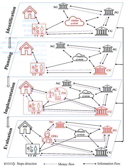Implementation process in China’s poverty alleviation. NG = national government, PG = provincial government, CG = county government, VT = village resident working team, PC = poverty commissioner, HH = household and individuals, IAs = implementation agents, TPEs = third party evaluators. The red color highlights the most important components in each step. Source: Authors’ deliberation.