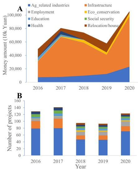 Poverty alleviation projects and their financial support in Jinggu County. (A,B) share the same legend.