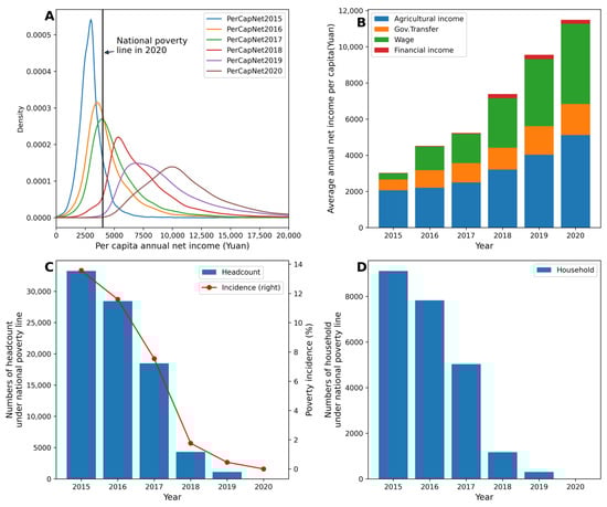 The results of poverty alleviation in Jinggu County: (A) per capita net income distribution among the monitored poor population. (B) The structure of average per capita annual net income. (C) Individuals under the national poverty line (2300 RMB/year/capita, 2010 PPP). (D) Number of households under the national poverty line.