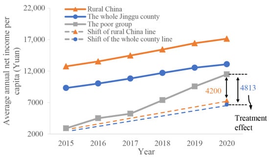 The comparison of average annual net income of the poor group, the whole Jinggu County, and rural China. Rural China and the whole Jinggu County are set as control groups, and dash lines are their shifts.