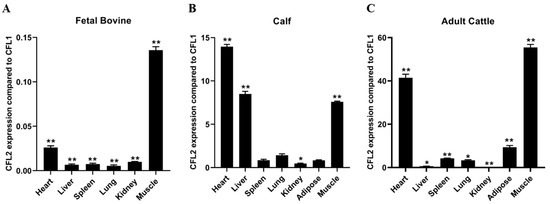 In fetal bovine tissue, the expression level of CFL2 in seven tissue samples, including heart, liver, spleen, lung, kidney, adipose, and muscle, was significantly lower than that of CFL1 (p < 0.01) (Figure 1A). In calf tissue, the expression level of CFL2 in the heart, liver, lung, and muscle was higher than that of CFL1. The expression level of CFL2 was the highest in heart tissue compared to CFL1, and the expression of CFL2 in liver and muscle tissues was also significantly higher than that of CFL1. There was no significant difference in expression in the spleen, lung, and adipose tissue (p > 0.05) (Figure 1B). In adult cattle tissue, the expression level of CFL2 in seven tissues, including heart, liver, spleen, lung, kidney, fat, and muscle, was significantly higher than that of CFL1 (p < 0.01). The expression level of CFL2 was extremely high in muscle and heart tissue compared with CFL1 expression (p < 0.01). The fold difference in relative expression level in heart tissue was nearly 40-fold and in muscle tissue was more than 40-fold. In addition, the expression levels of CFL2 and CFL1 in liver, spleen, lung, kidney, and adipose tissue were also significantly different, and the expression of CFL2 was significantly higher than that of CFL1 (p < 0.01) (Figure 1C).